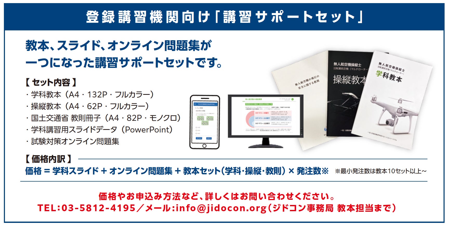 日本最大の自動車学校によるドローンネットワーク組織 : 通称ジドコンは、登録講習機関としてドローンスクール運営を目指す自動車学校へのノウハウ提供や、ドローンスクール運営にお困りの学校をサポートをする「講習サポートセット」の提供を開始します。